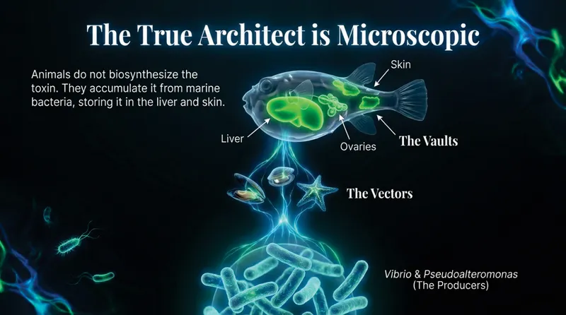 For decades, scientists debated where TTX comes from. The prevailing theory today is exogenous origin. Research suggests that TTX is primarily produced by marine bacteria, such as species of Vibrio, Pseudomonas, and Shewanella. These bacteria enter the food chain and are accumulated by larger animals.