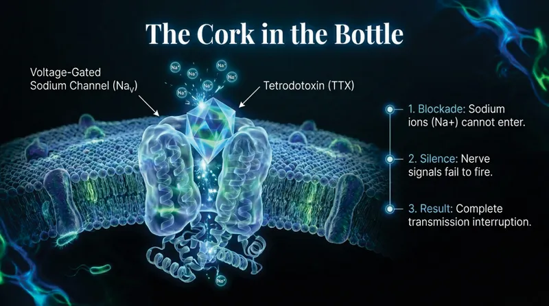 The mechanism of TTX is terrifyingly precise. It acts as a selective blocker of voltage-gated sodium channels on the surface of nerve membranes. Imagine your nerves as electrical wires; sodium channels are the switches that allow signals to flow. TTX acts like a plug, physically blocking the outer opening of these channels. This prevents sodium ions from entering the cell, effectively shutting down the transmission of nerve impulses. The result? Muscles cannot contract, and sensory signals cannot reach the brain.