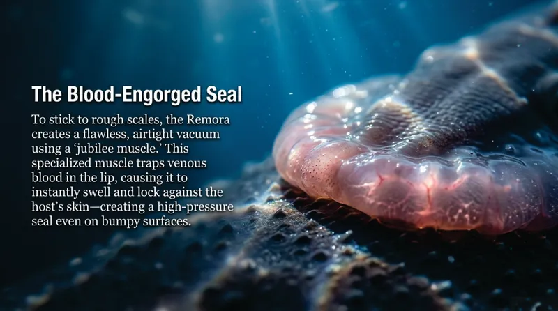 When the remora finds a host, a specialized muscle (known by scientists as the "jubilee muscle") temporarily stops the venous blood from leaving this lip. The lip instantly swells up with blood, becoming incredibly tight and squishy. This creates a flawless, high-pressure vacuum seal against the host's skin - even if that skin is rough, bumpy, or covered in scales.