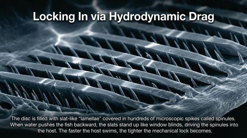 These slats are covered in hundreds of microscopic, tooth-like spikes called spinules. When the water pushes the remora backward, this backward motion automatically causes the slats to stand up. The tiny spinules dig into the host's skin, locking the fish in place. The faster the host swims, the tighter the remora's mechanical lock becomes! To detach, the remora simply swims slightly forward, the slats fold flat, and it releases in a fraction of a second.