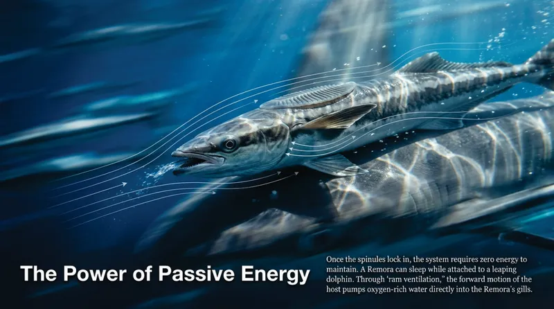 The most mind-blowing part of this biological lock is that it requires absolutely zero energy to maintain. Once the remora is locked on, the system is completely passive. A remora can literally go to sleep while stuck to a leaping dolphin!