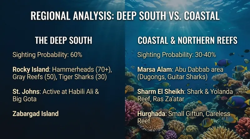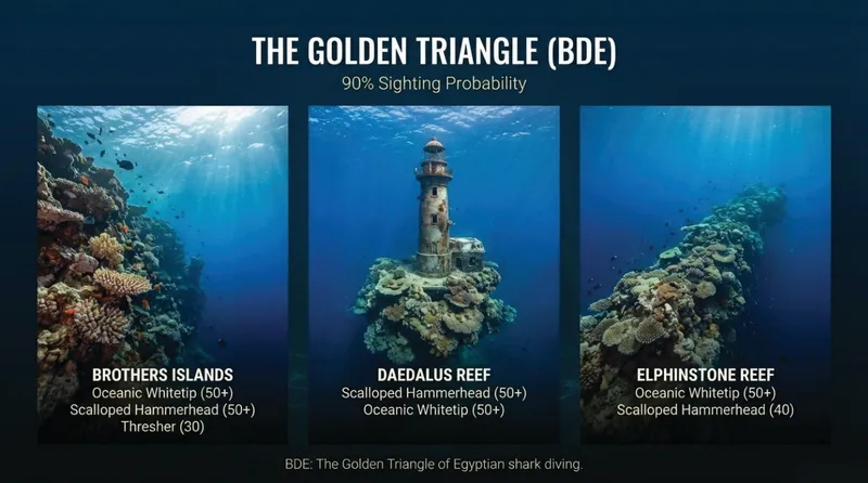 For those seeking high-probability encounters (90%+), the offshore reefs of Brothers, Daedalus, and Elphinstone are the undisputed crown jewels: