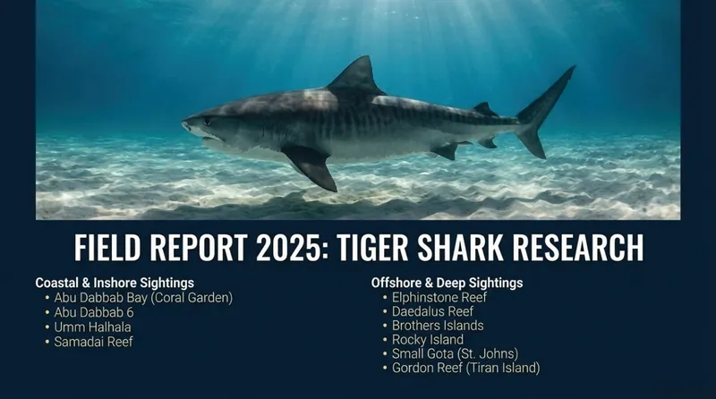 Tiger Sharks (Galeocerdo cuvier) continue to be a focal point of our research. In 2025, we documented their presence across both coastal nurseries like Abu Dabbab and deep offshore walls, proving the importance of connected marine corridors for these wide-ranging predators.