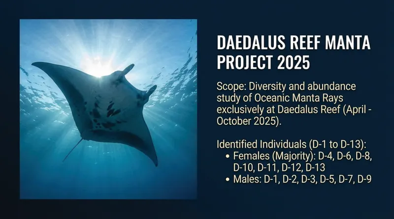 Between April and October, Daedalus Reef serves as a critical aggregation site for Oceanic Manta Rays. We have identified 13 unique individuals (D-1 through D-13). The majority are females, providing vital data on the reproductive health and migration patterns of these gentle giants.
