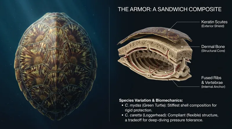Think of a sea turtle's shell not as a single shield, but as a high-tech "sandwich." The top layer is made of keratin scutes (the same stuff as your fingernails), followed by a core of dermal bone, and finally an internal anchor where their ribs and spine are actually fused to the shell! This design is built for pressure. While a land turtle has a very stiff shell, sea turtles have "compliant" or slightly flexible shells. This allows them to dive deep without their armor cracking under the heavy weight of the ocean.