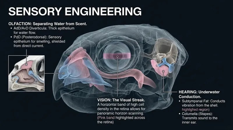 Sea turtles "see" and "smell" the world in incredible ways. Inside their nose, they have special diverticula that separate water from scent, allowing them to track food across vast distances. Their eyes feature a "Visual Streak" - a horizontal band of high cell density in the retina. This gives them a panoramic view of the horizon, perfect for scanning the open ocean for predators or mates.