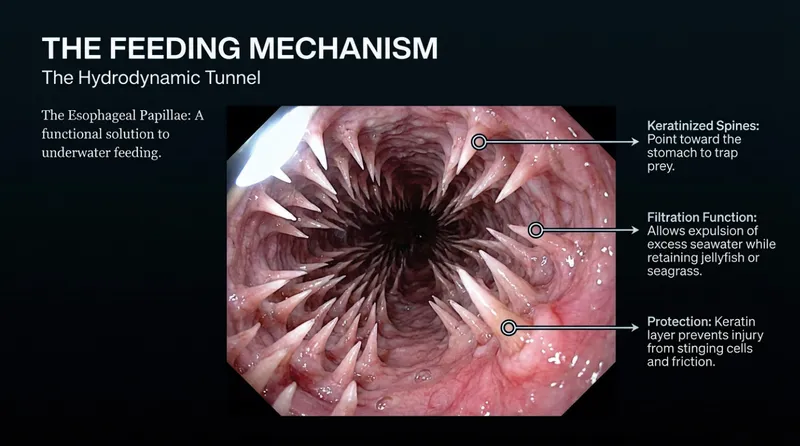 These spikes also protect the turtle's throat from the stinging cells of jellyfish. This "Hydrodynamic Tunnel" is an elegant evolutionary solution to the problem of eating underwater without swallowing the entire ocean or getting stung from the inside!