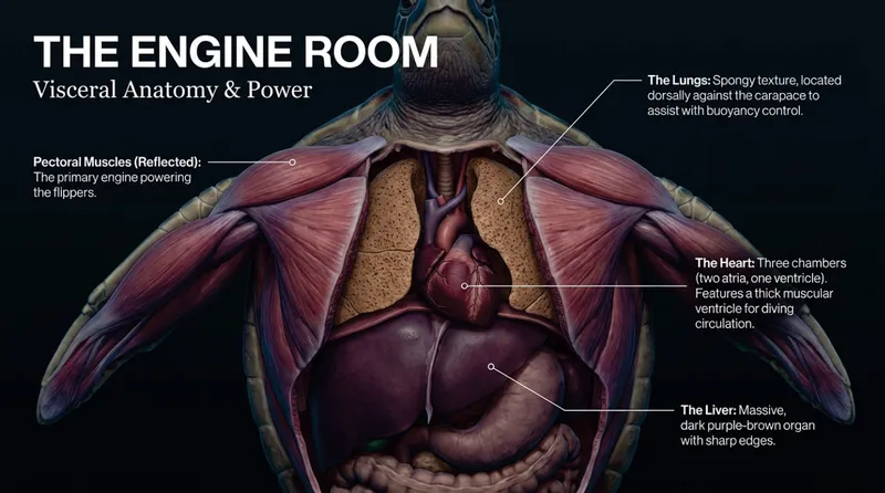 Under the shell lies the "Engine Room." The massive pectoral muscles are the primary engines powering those long, graceful flippers. Because they need to stay underwater for a long time, their lungs are located dorsally (on their back) right against the shell. This position helps them stay balanced and provides extra buoyancy control, acting like a built-in life jacket.