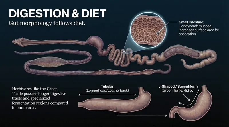 A turtle's gut tells the story of its diet. Herbivores like the Green Turtle have much longer digestive tracts and specialized "fermentation regions" to help them break down tough seagrass. Their small intestines have a "honeycomb" texture to increase the surface area, ensuring they absorb every bit of nutrition from their leafy meals.