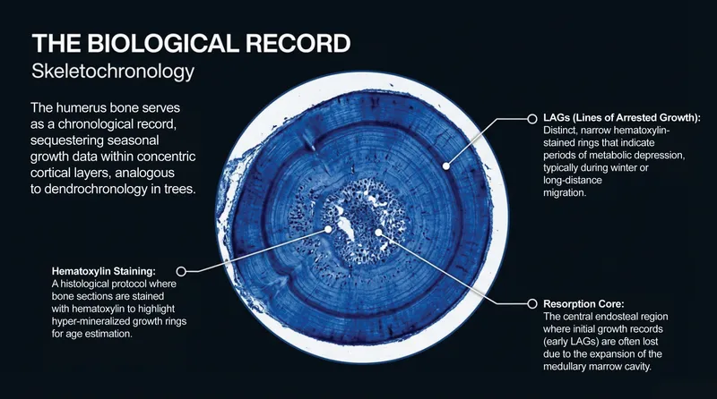 Much like an ancient oak tree, a sea turtle’s life story is etched into its bones. This science is called Skeletochronology. By looking at a cross-section of the humerus (the flipper bone), scientists can see concentric rings. Each ring represents a year of growth. The dark, narrow rings are called LAGs (Lines of Arrested Growth), which happen during winter or long migrations when the turtle isn't growing much.