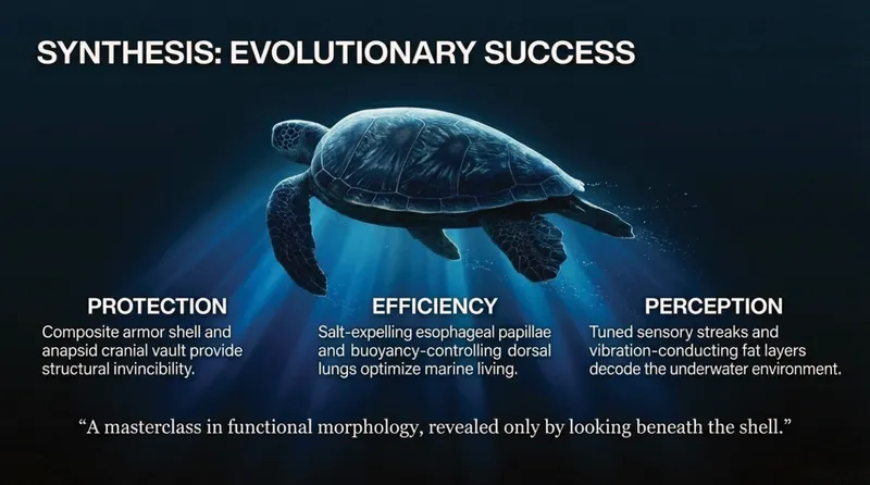 Everything we’ve seen - the sandwich-armor shell, the salt-expelling throat spikes, the vibration-conducting fat, and the secret bone clocks - comes together to create one of nature’s most successful designs. Sea turtles don't just survive in the ocean; they dominate it.
