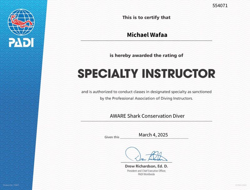 Michael Wafaa is an experienced shark diver and shark conservation awareness instructor operating in the Red Sea, Egypt. He focuses on shark-focused guided dives, shark conservation education, and project-based dive experiences for divers seeking responsible encounters with sharks and other large pelagic species. His services emphasize safety, conservation awareness, and site-specific knowledge of Red Sea shark locations, and he organizes guided shark dives, photography-friendly encounters, and educational briefings that combine practical diving skills with marine conservation messaging. Michael presents himself as a professional solo operator and guide rather than a traditional multi-instructor dive center or liveaboard, offering personalized guiding, project coordination, and collaboration with other local dive providers for boat access and logistics. The site highlights his background, projects (including curated shark dive site information and conservation initiatives), and professional credentials relevant to diving instruction and shark awareness. This makes him a resource for divers seeking specialist shark-guiding and conservation-focused dive experiences in the Red Sea region.